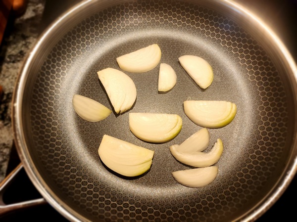 후라이팬에 양파 반개를 채썰어서 듬성듬성 깔아주세요