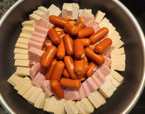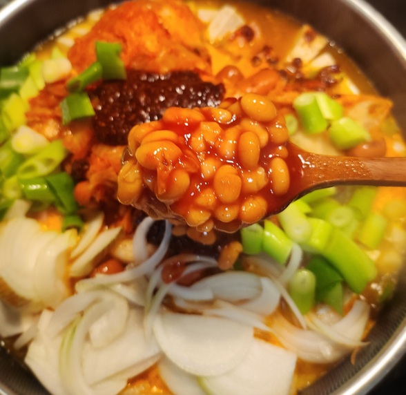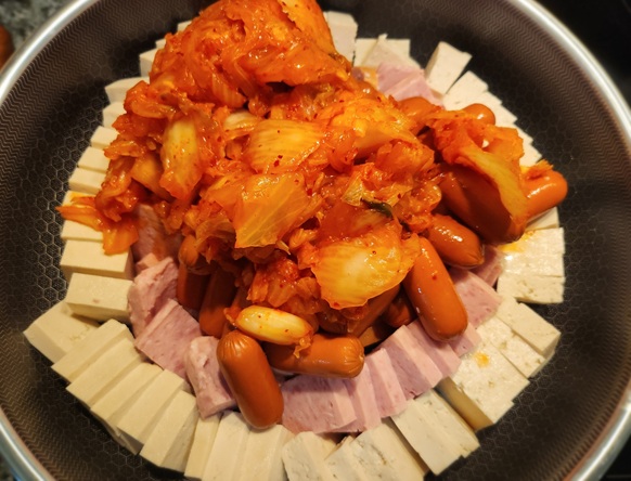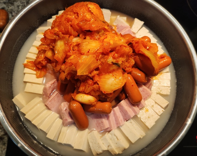 스팸 1개 각종 소세지 원하는 만큼 김치 한포기 비비고 사골육수 1봉지양파 1개 대파 1개 설탕 1스푼진간장 2스푼다진마늘 1스푼고춧가루 2스푼맛술 2스푼후추 톡톡고추장 1스푼베이크드 빈 2스푼