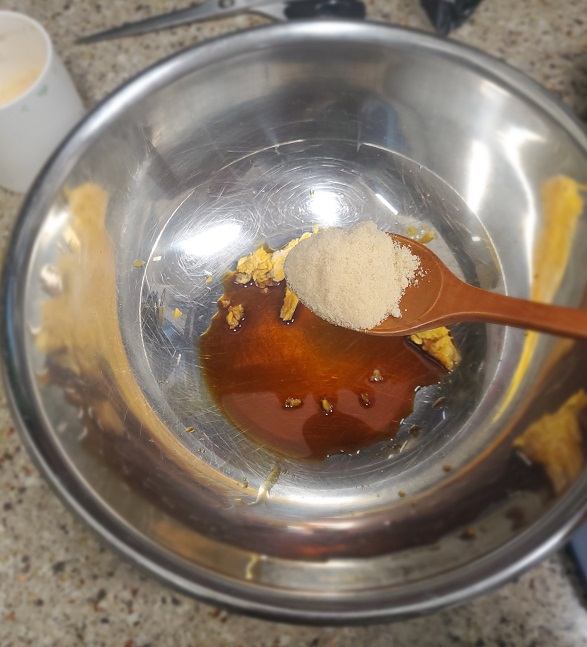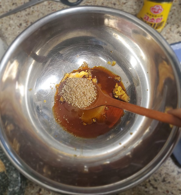 커다란 볼에 마늘 2스푼, 간장 4스푼, 깨소금 2스푼, 설탕 2스푼을 넣어준다.